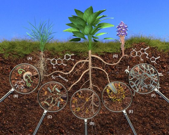 - 土(地球の断面図)+根圏にいる微生物のイラスト